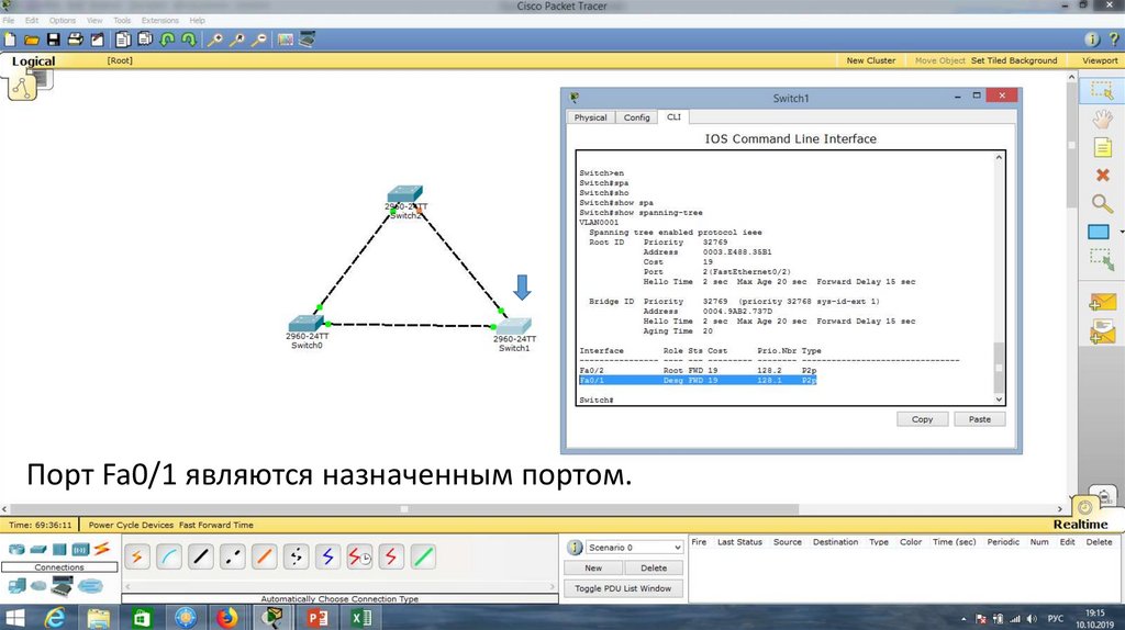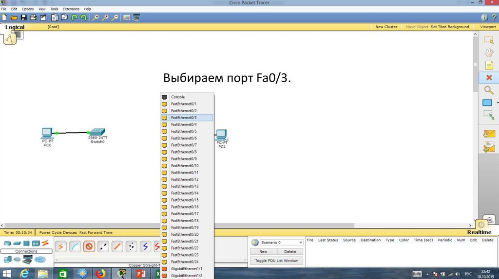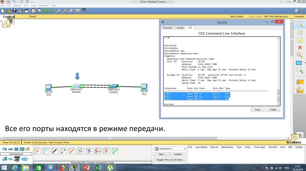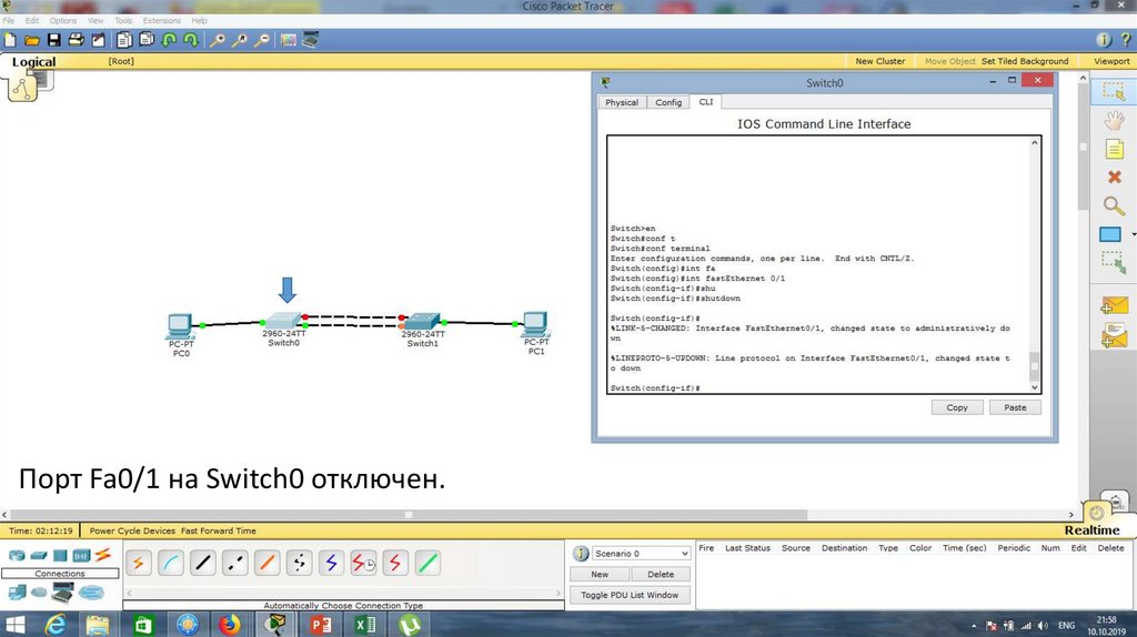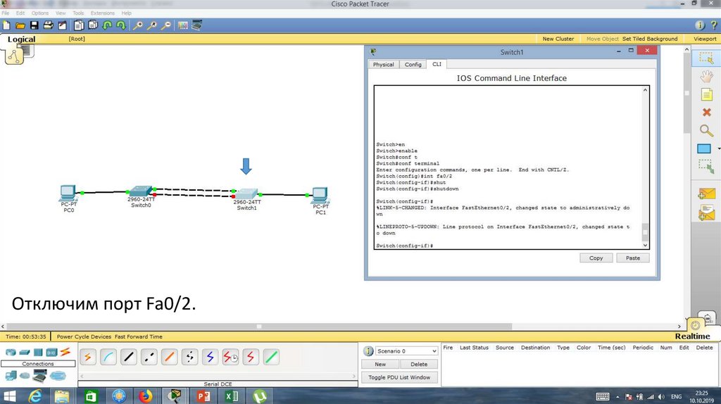 Порт Fa0/1 на Switch0 отключен.23.
