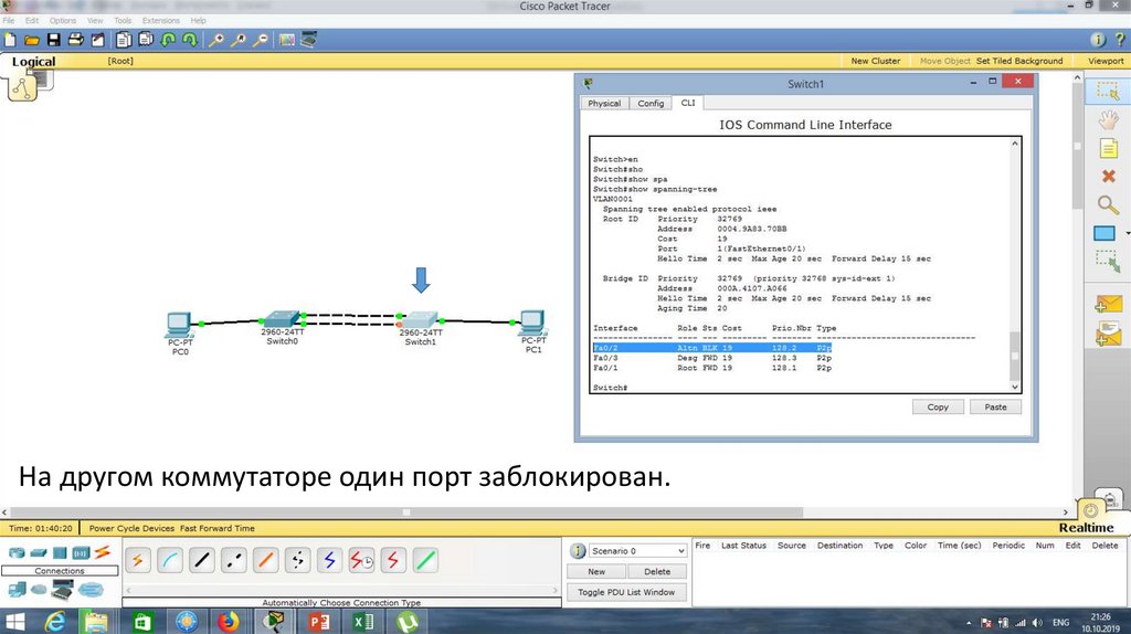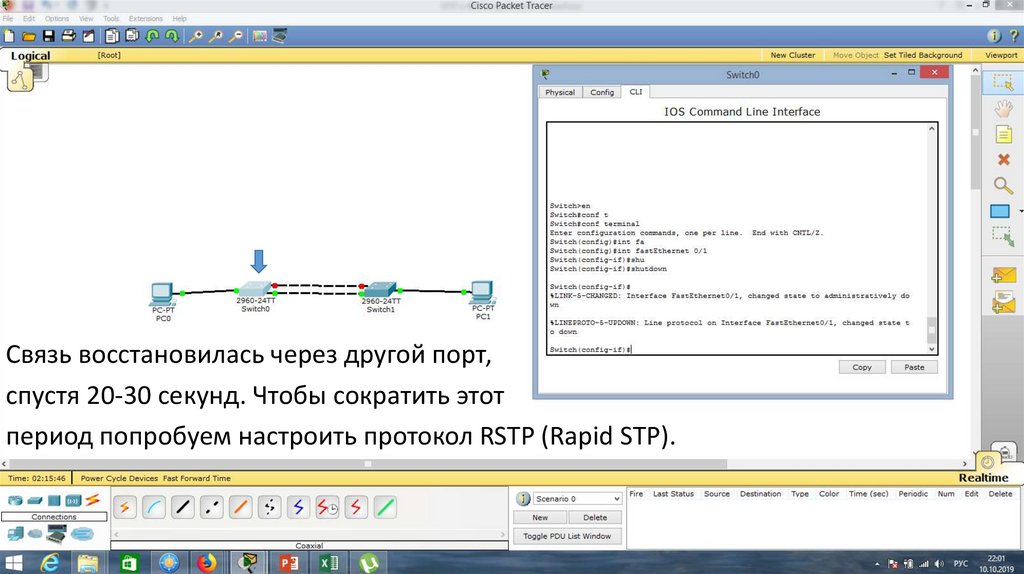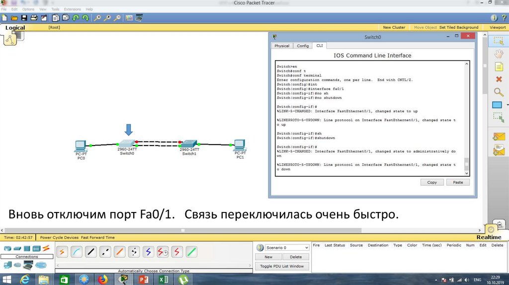 Вновь отключим порт Fa0/1. Связь переключилась очень быстро.29.