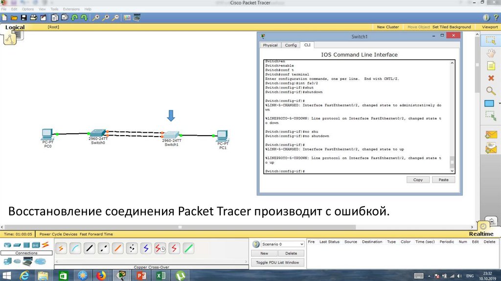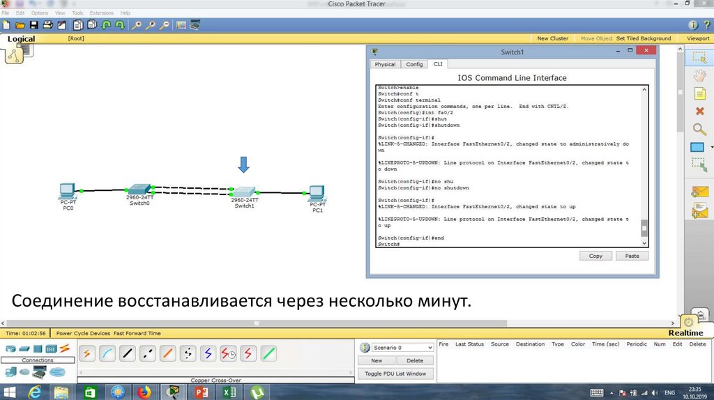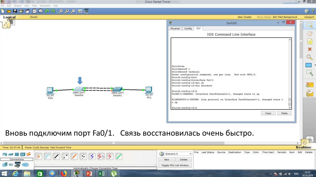 Вновь подключим порт Fa0/1. Связь восстановилась очень быстро.28.