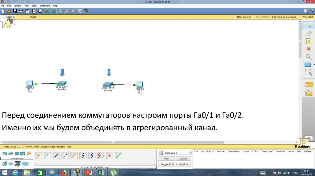 Перед соединением коммутаторов настроим порты Fa0/1 и Fa0/2.Именно их мы будем объединять в агрегированный канал.