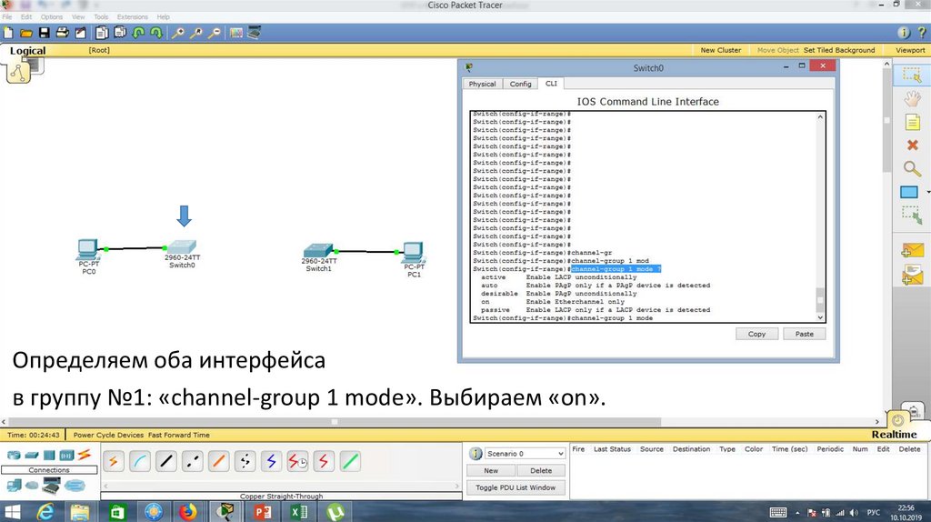 Определяем оба интерфейсав группу №1: «channel-group 1 mode». Выбираем «on».
