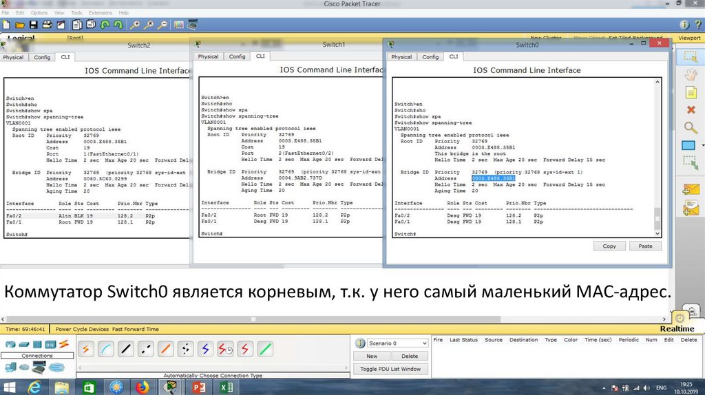 Коммутатор Switch0 является корневым, т.к. у него самый маленький MAC-адрес.11.