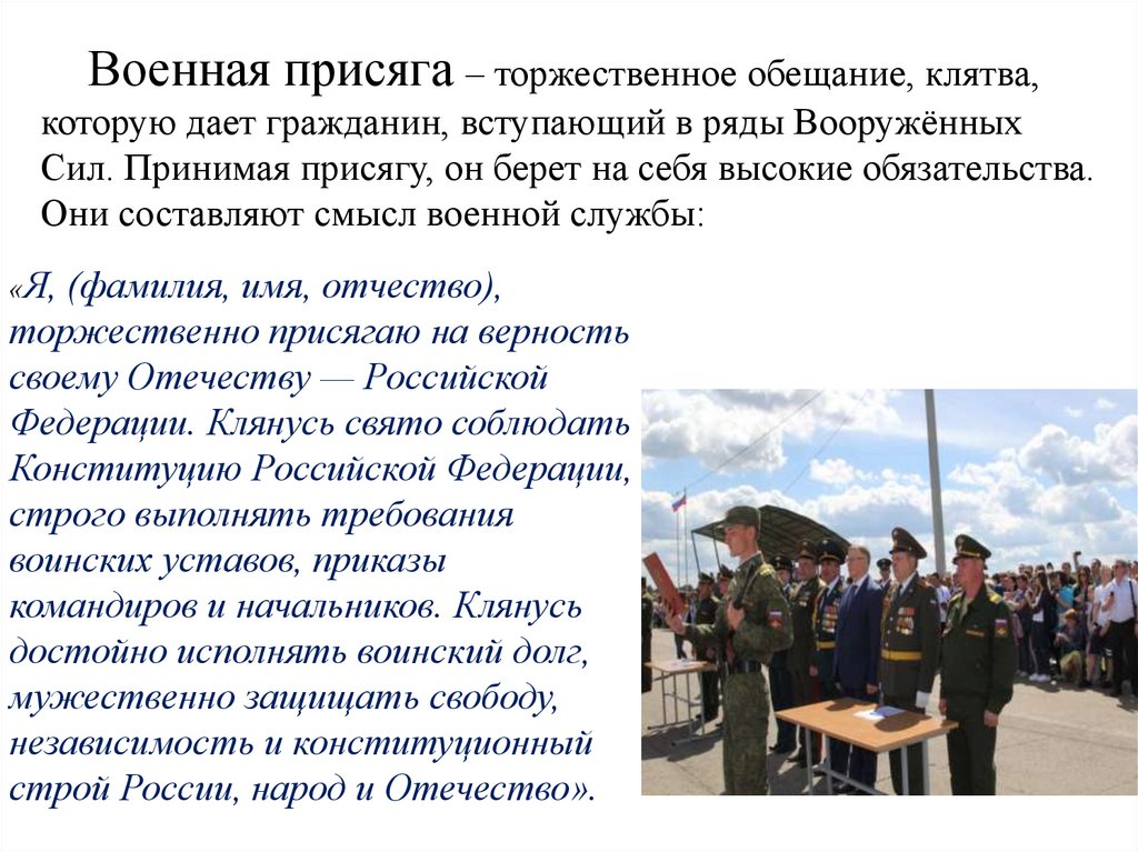 Военная присяга – торжественное обещание, клятва,которую дает гражданин, вступающий в ряды Вооружённых