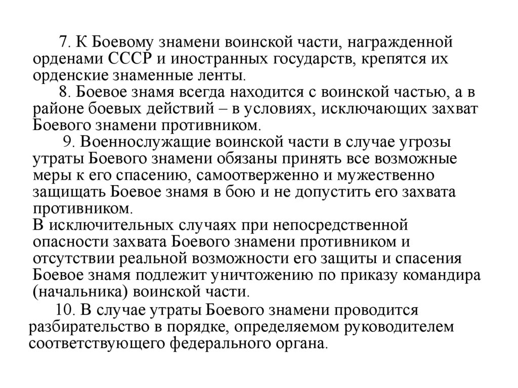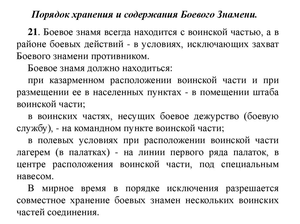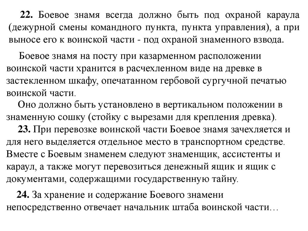 22. Боевое знамя всегда должно быть под охраной караула(дежурной смены командного пункта, пункта управления), а при