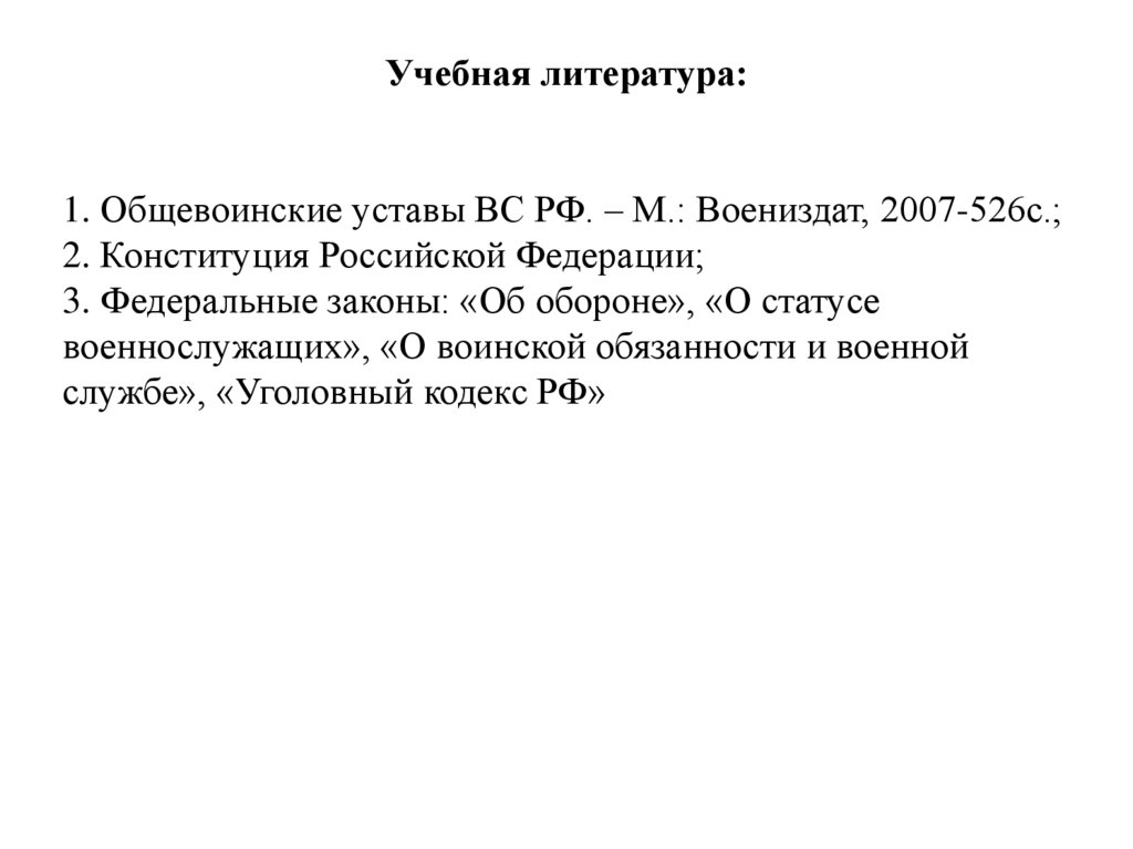 Учебная литература:1. Общевоинские уставы ВС РФ. – М.: Воениздат, 2007-526с.;