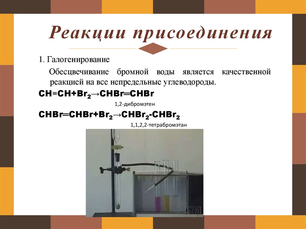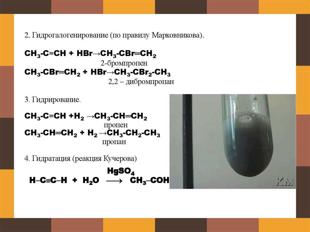 2. Гидрогалогенирование (по правилу Марковникова).СH3-C≡CH + HBr→CH3-CBr═CH2