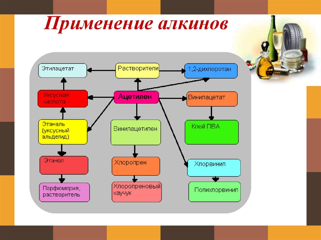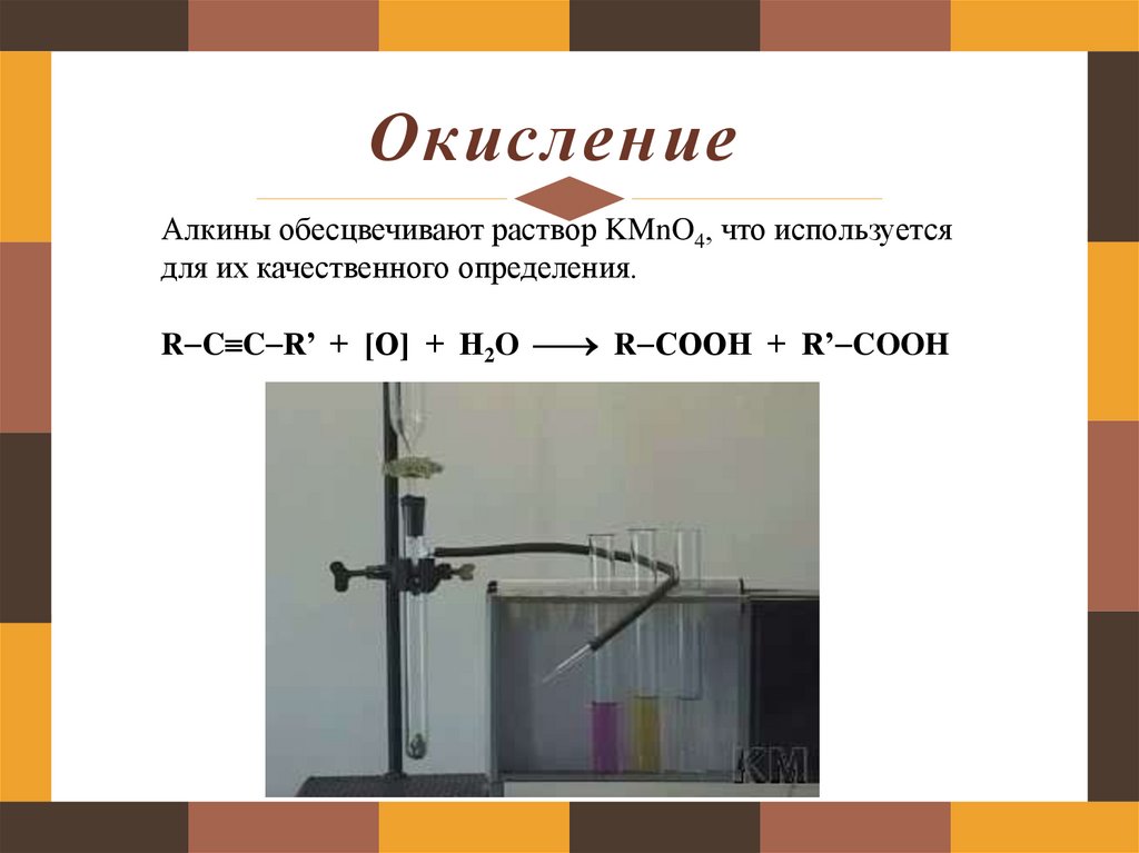 ОкислениеАлкины обесцвечивают раствор KMnO4, что используется