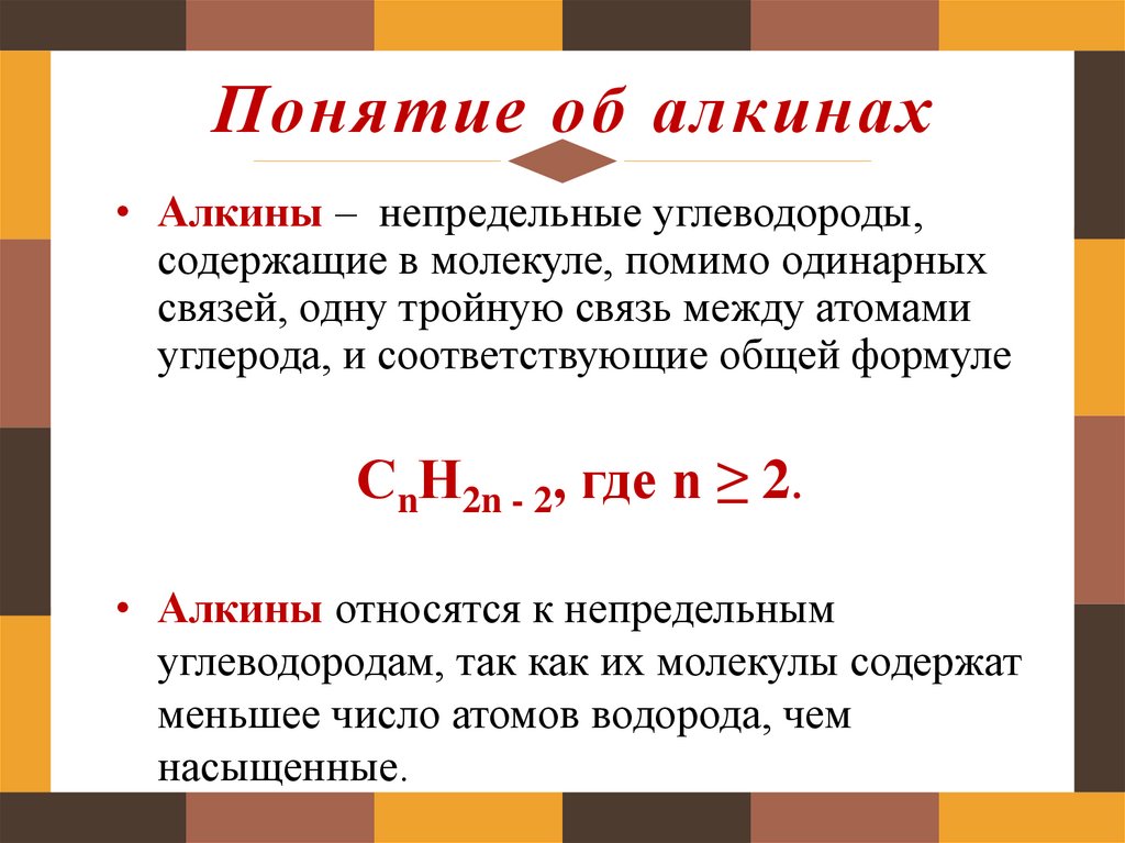 Понятие об алкинах• Алкины – непредельные углеводороды,
