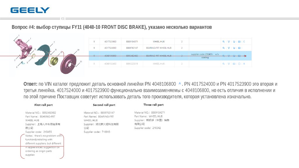 Вопрос #4: выбор ступицы FY11 (4048-10 FRONT DISC BRAKE), указано несколько вариантовОтвет: по VIN каталог предложит деталь основной линейки PN 4048106800 . PN 4017524000 и PN 4017523900 это вторая и