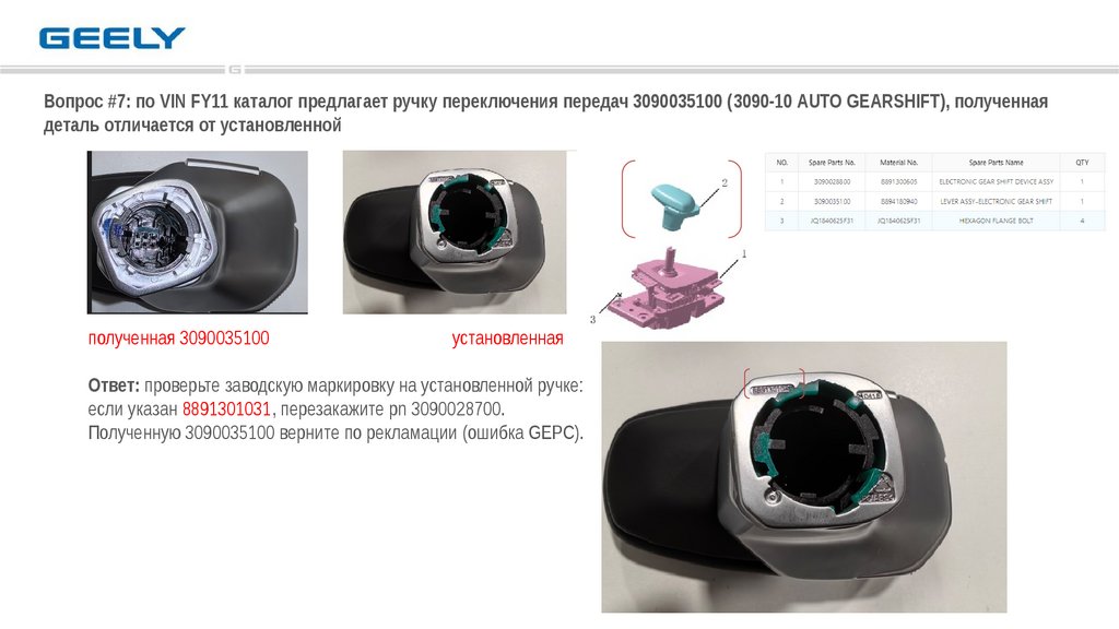 Вопрос #7: по VIN FY11 каталог предлагает ручку переключения передач 3090035100 (3090-10 AUTO GEARSHIFT), полученнаядеталь отличается от установленной