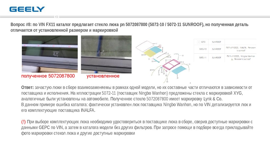 Вопрос #8: по VIN FX11 каталог предлагает стекло люка pn 5072087800 (5072-10 / 5072-11 SUNROOF), но полученная детальотличается от установленной размером и маркировкой