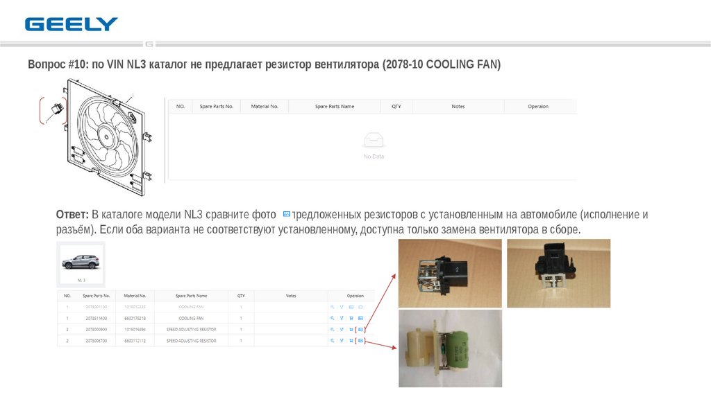 Вопрос #10: по VIN NL3 каталог не предлагает резистор вентилятора (2078-10 COOLING FAN)Ответ: В каталоге модели NL3 сравните фото предложенных резисторов с установленным на автомобиле (исполнение и