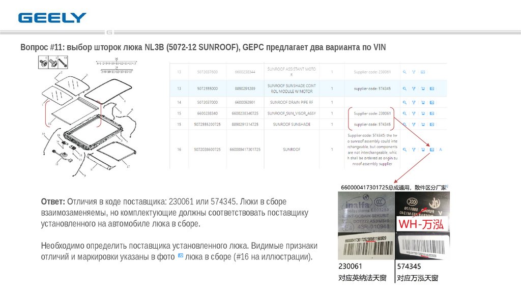 Вопрос #11: выбор шторок люка NL3B (5072-12 SUNROOF), GEPC предлагает два варианта по VINОтвет: Отличия в коде поставщика: 230061 или 574345. Люки в сборе