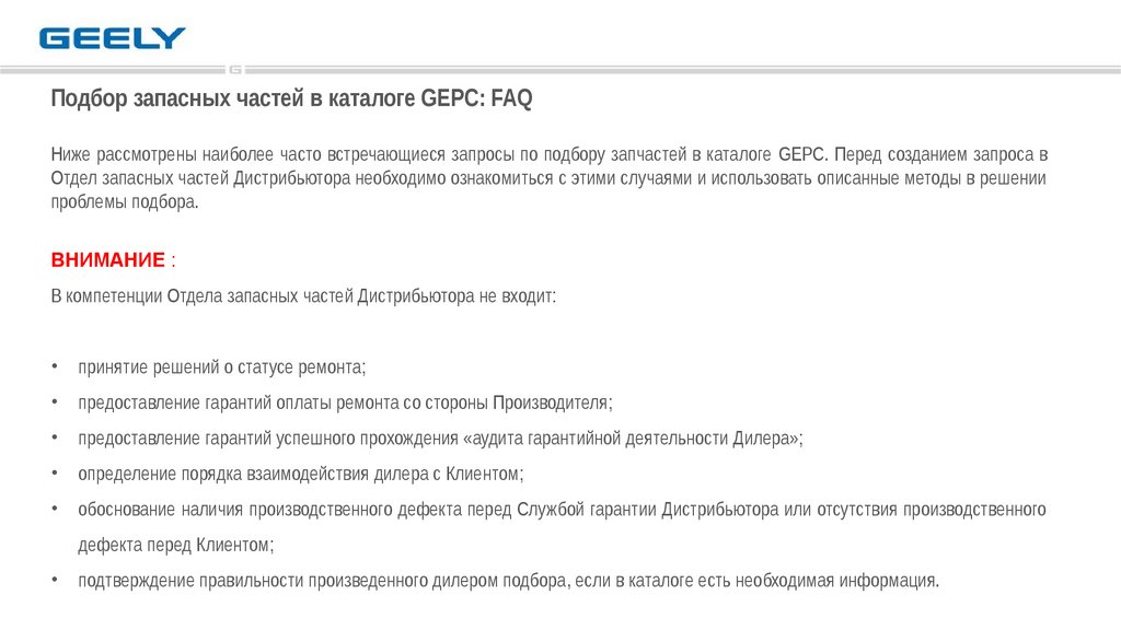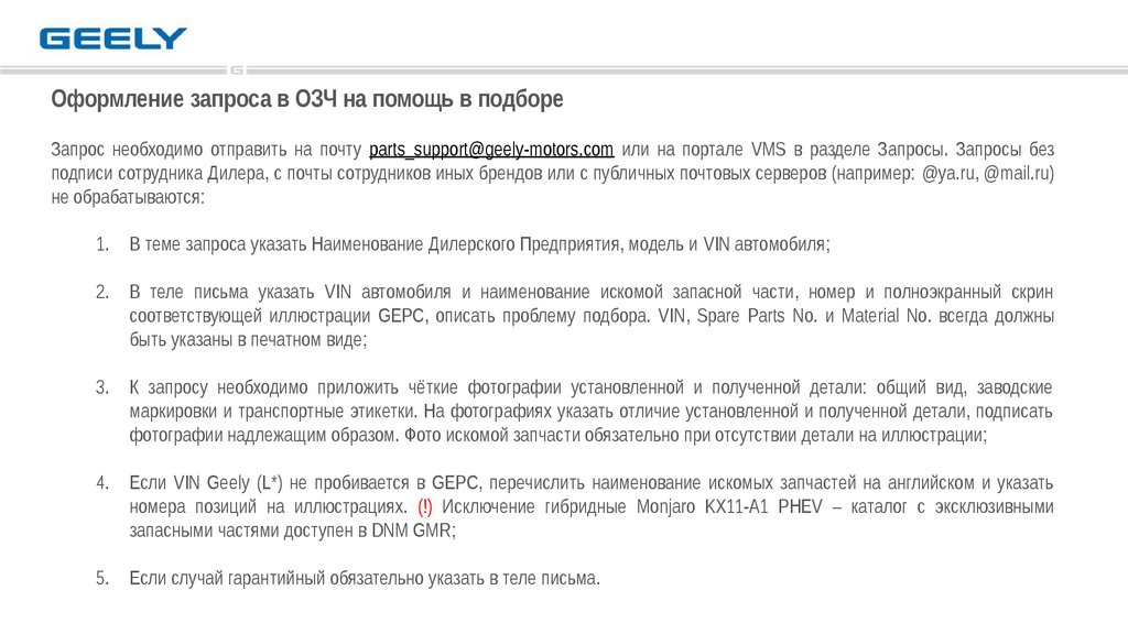 Оформление запроса в ОЗЧ на помощь в подбореЗапрос необходимо отправить на почту parts_support@geely-motors.com или на портале VMS в разделе Запросы. Запросы без