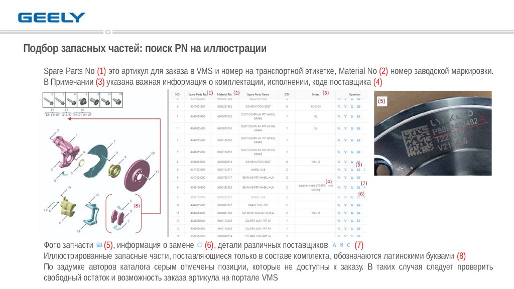 Подбор запасных частей: поиск PN на иллюстрацииSpare Parts No (1) это артикул для заказа в VMS и номер на транспортной этикетке, Material No (2) номер заводской маркировки.