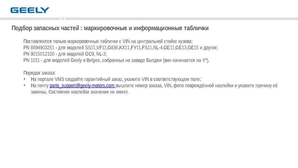 • На почту parts_support@geely-motors.com вышлите номер заказа, VIN, фото повреждённой наклейки и укажите причину её