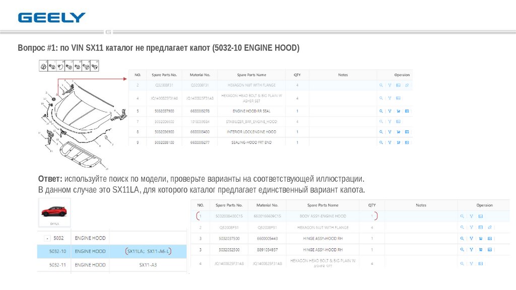 Вопрос #1: по VIN SX11 каталог не предлагает капот (5032-10 ENGINE HOOD)Ответ: используйте поиск по модели, проверьте варианты на соответствующей иллюстрации.