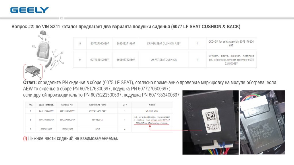 Вопрос #2: по VIN SX11 каталог предлагает два варианта подушки сиденья (6077 LF SEAT CUSHION & BACK)Ответ: определите PN сиденья в сборе (6075 LF SEAT), согласно примечанию проверьте маркировку на модуле обогрева: если