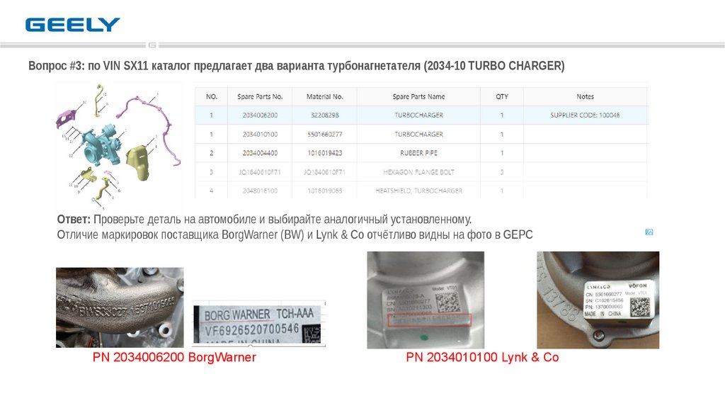 Вопрос #3: по VIN SX11 каталог предлагает два варианта турбонагнетателя (2034-10 TURBO CHARGER)Ответ: Проверьте деталь на автомобиле и выбирайте аналогичный установленному.
