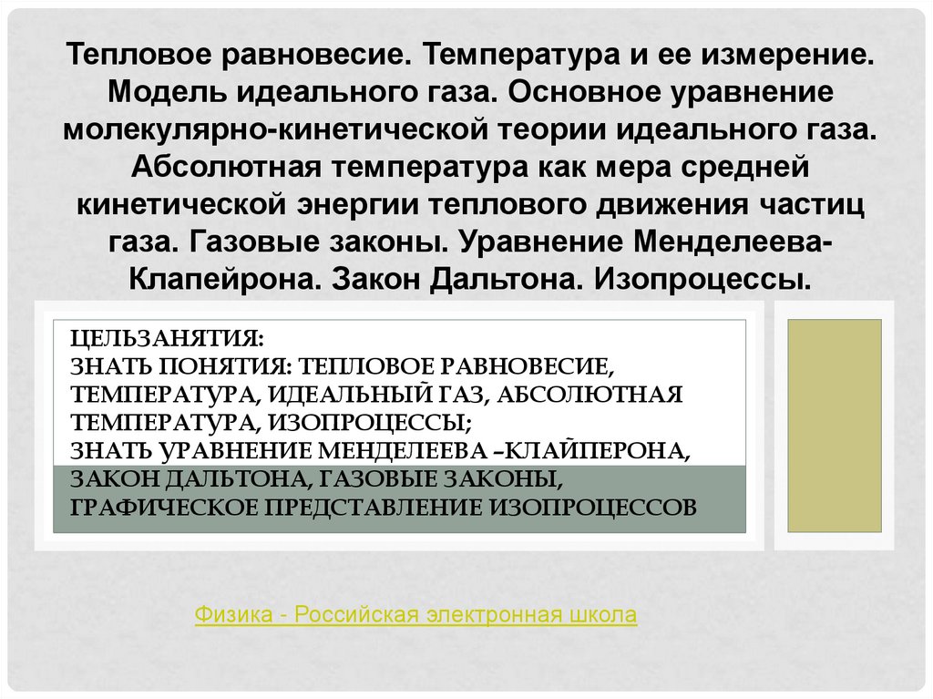 1. Цельзанятия: знать понятия: тепловое равновесие, температура, идеальный газ, абсолютная температура, изопроцессы; знать
