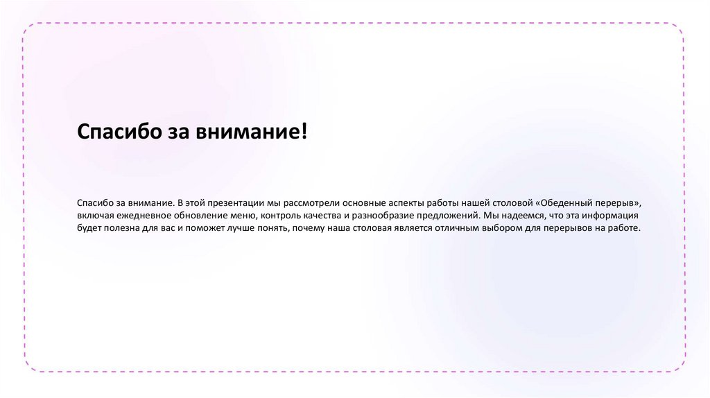 Спасибо за внимание!Спасибо за внимание. В этой презентации мы рассмотрели основные аспекты работы нашей столовой «Обеденный перерыв»,