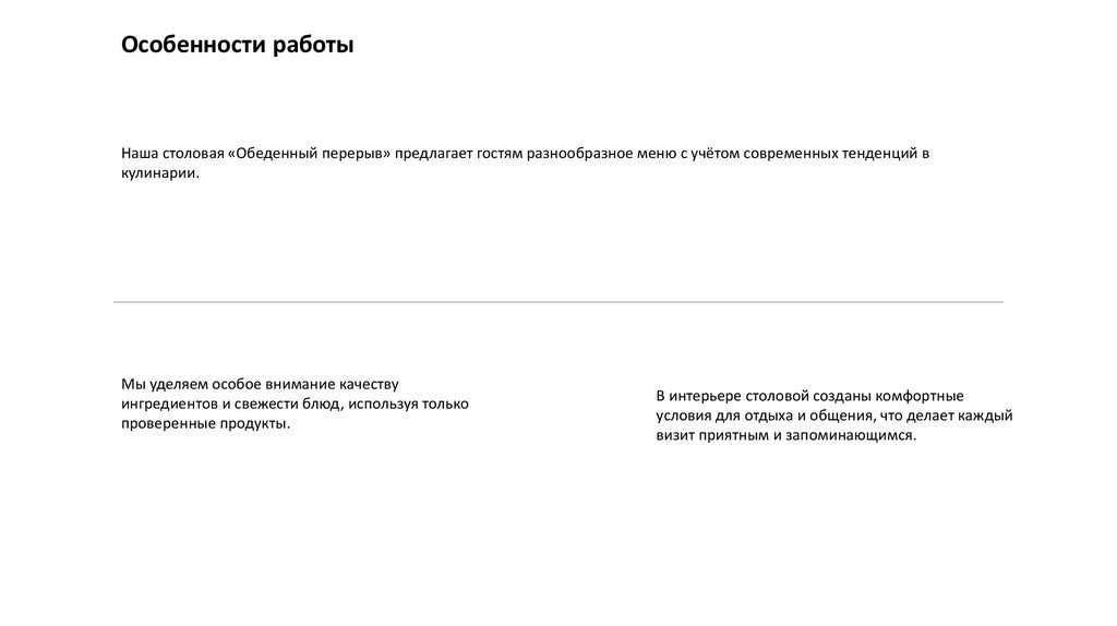Особенности работыНаша столовая «Обеденный перерыв» предлагает гостям разнообразное меню с учётом современных тенденций в