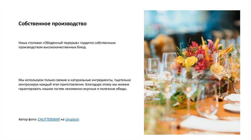 Собственное производствоНаша столовая «Обеденный перерыв» гордится собственным