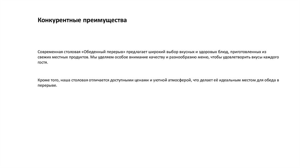 Конкурентные преимуществаСовременная столовая «Обеденный перерыв» предлагает широкий выбор вкусных и здоровых блюд, приготовленных из