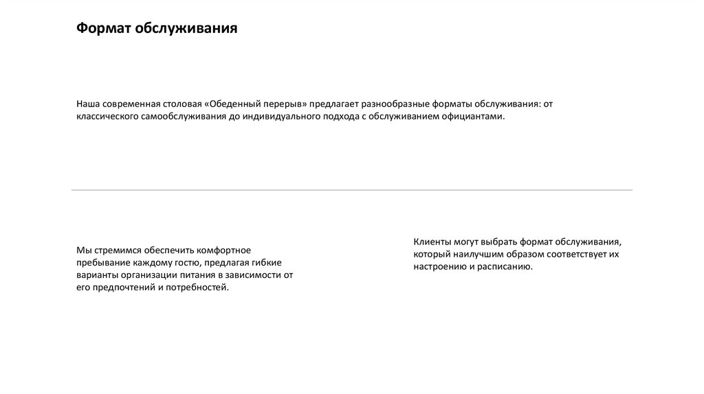 Формат обслуживанияНаша современная столовая «Обеденный перерыв» предлагает разнообразные форматы обслуживания: от