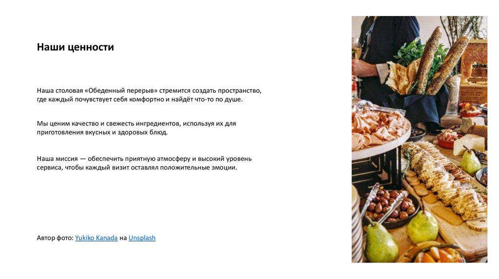 Наши ценностиНаша столовая «Обеденный перерыв» стремится создать пространство,