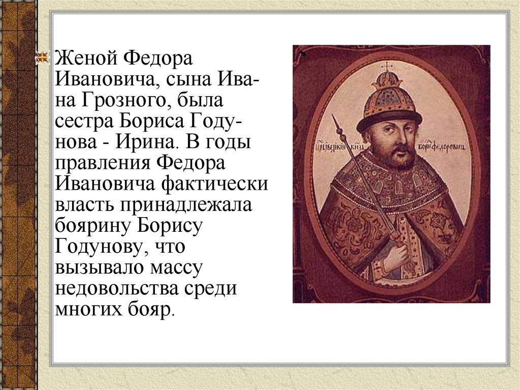 Женой ФедораИвановича, сына Ивана Грозного, была