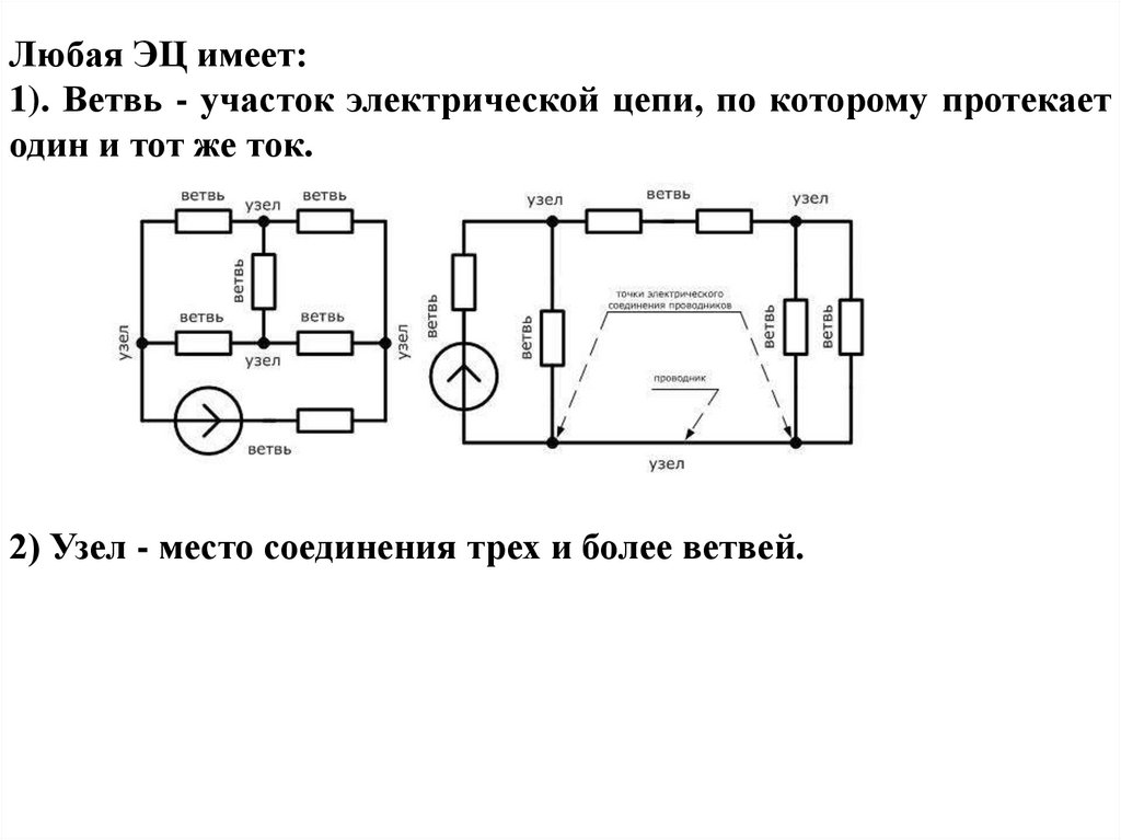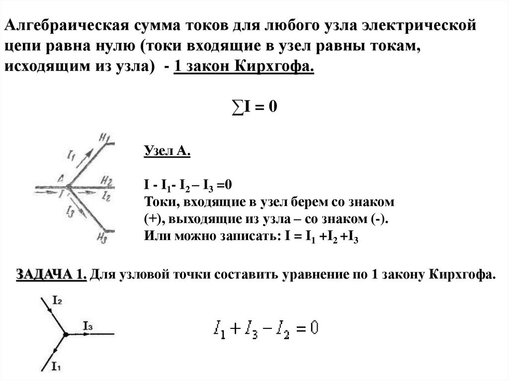 Алгебраическая сумма токов для любого узла электрическойцепи равна нулю (токи входящие в узел равны токам,
