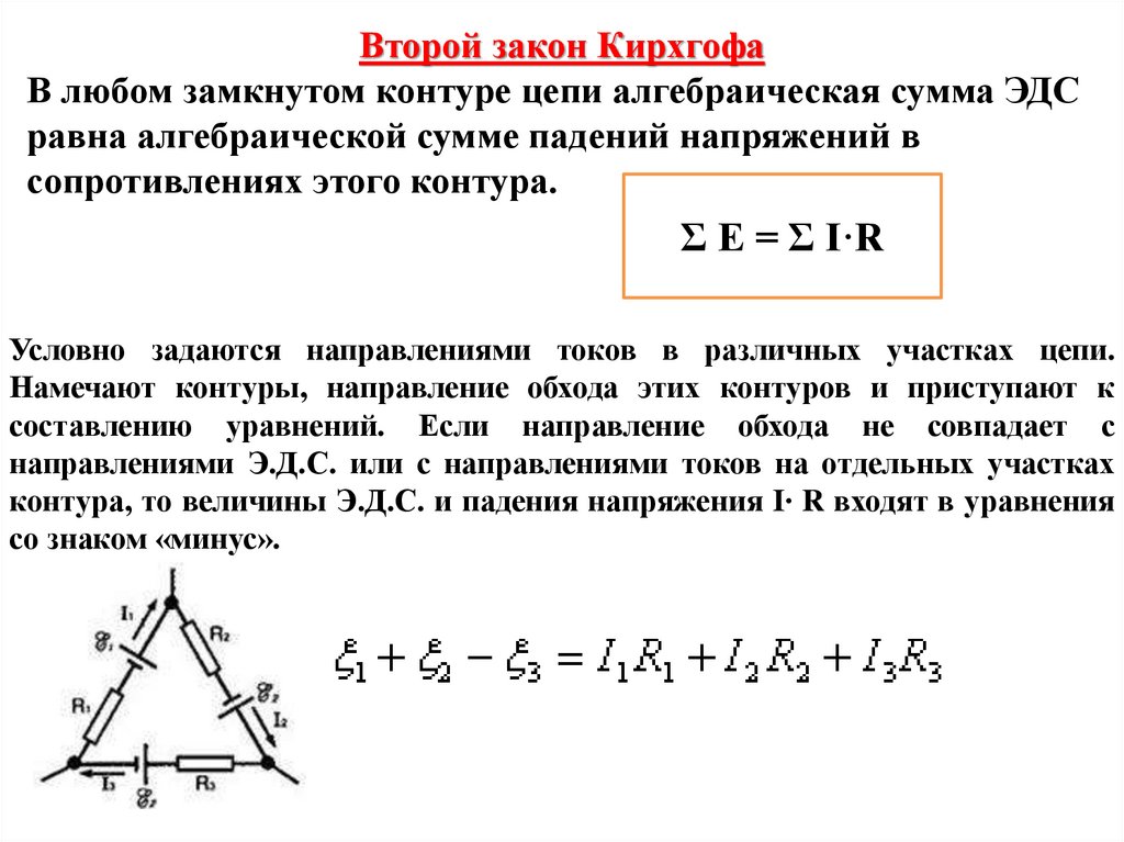 Второй закон КирхгофаВ любом замкнутом контуре цепи алгебраическая сумма ЭДС