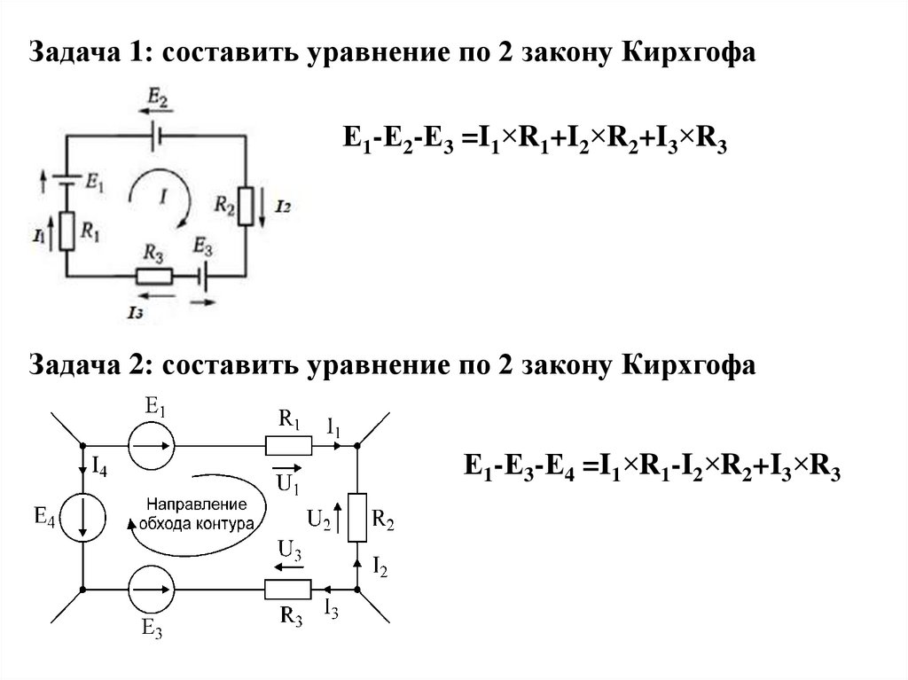 Задача 1: составить уравнение по 2 закону КирхгофаЕ1-Е2-Е3 =I1×R1+I2×R2+I3×R3