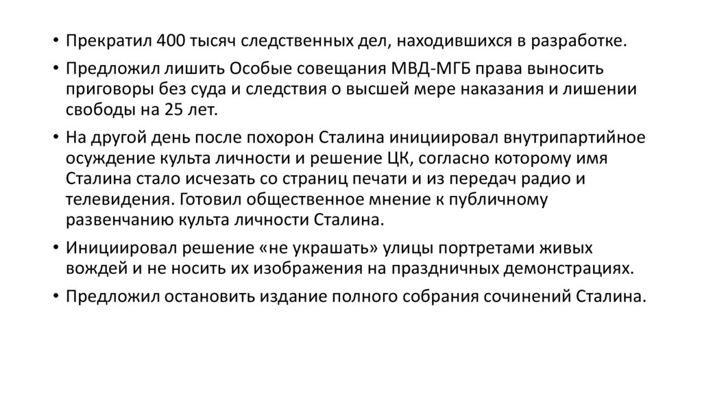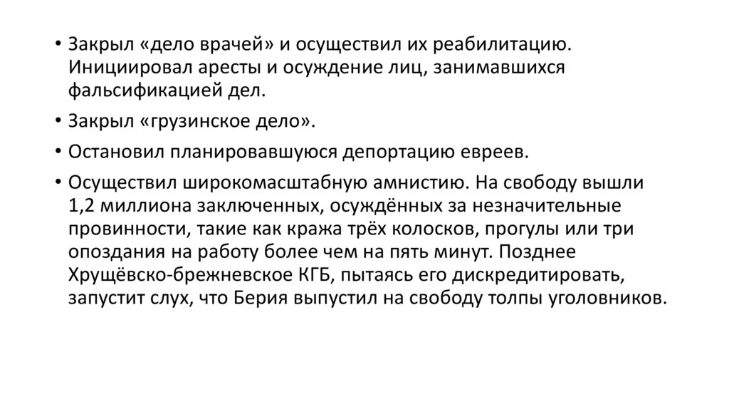 • Закрыл «дело врачей» и осуществил их реабилитацию.Инициировал аресты и осуждение лиц, занимавшихся