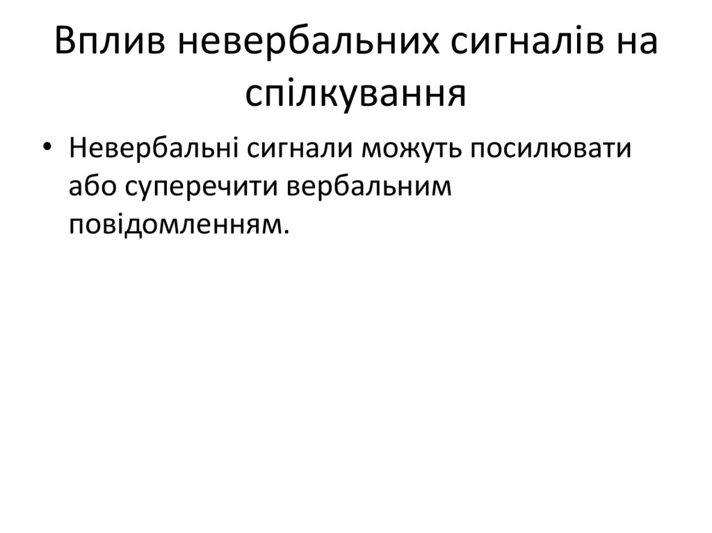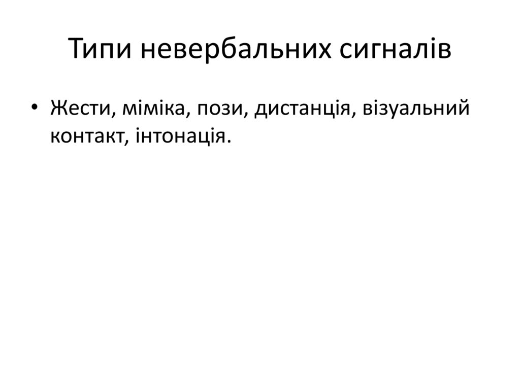 Типи невербальних сигналів• Жести, міміка, пози, дистанція, візуальний