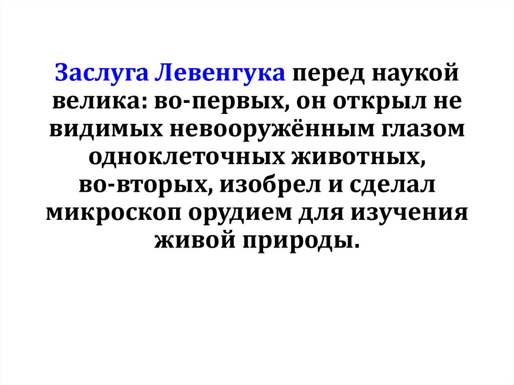 Заслуга Левенгука перед наукойвелика: во-первых, он открыл не