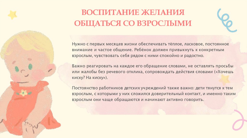 внимание и частое общение. Ребёнок должен привыкнуть к конкретным