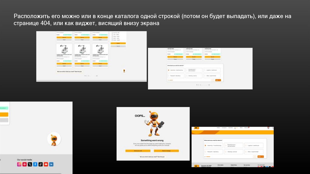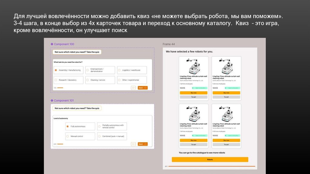 Для лучшей вовлечённости можно добавить квиз «не можете выбрать робота, мы вам поможем».3-4 шага, в конце выбор из 4х карточек товара и переход к основному каталогу. Квиз - это игра,
