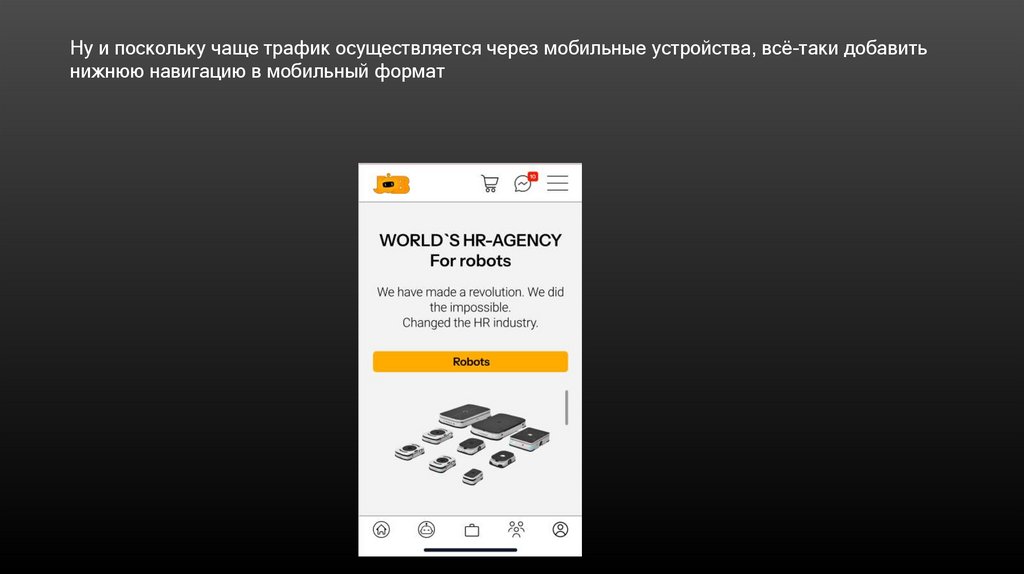Ну и поскольку чаще трафик осуществляется через мобильные устройства, всё-таки добавитьнижнюю навигацию в мобильный формат