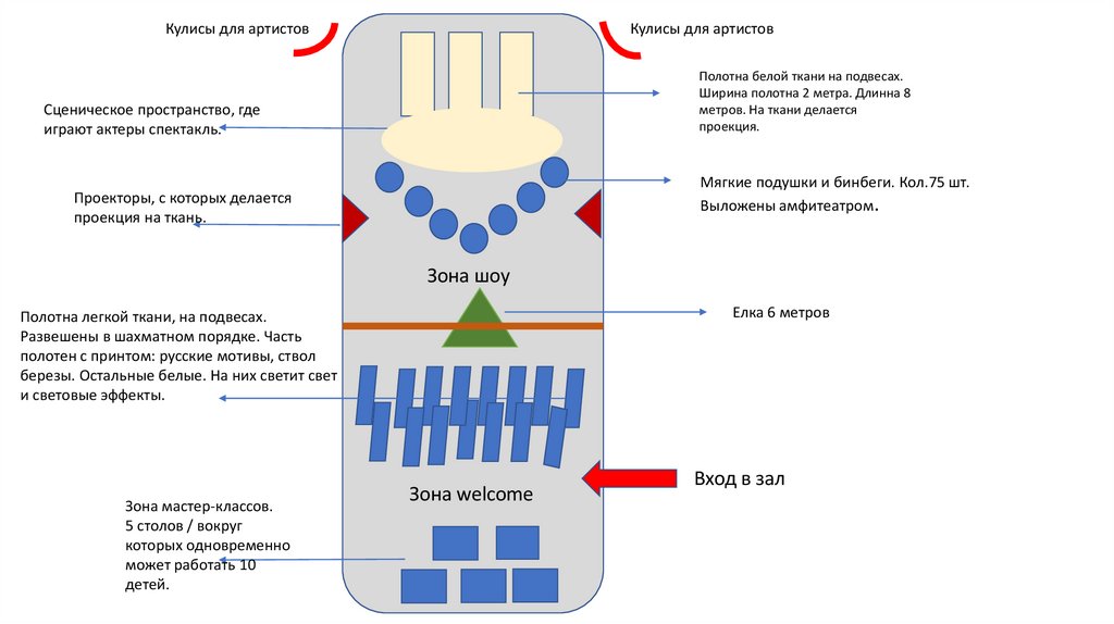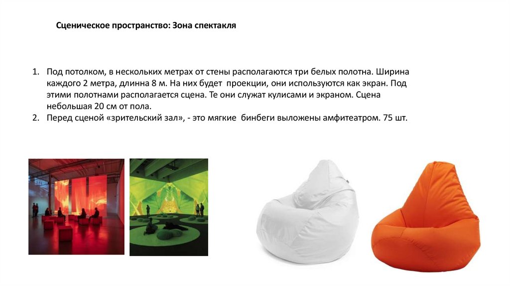 2. Перед сценой «зрительский зал», - это мягкие бинбеги выложены амфитеатром. 75 шт.
