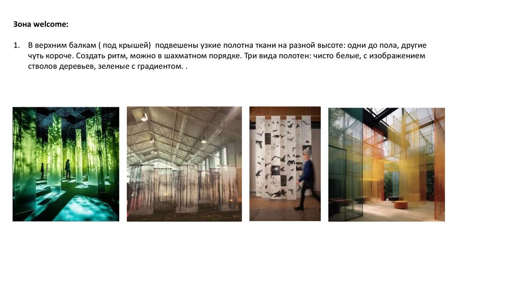 Зона welcome:1. В верхним балкам ( под крышей) подвешены узкие полотна ткани на разной высоте: одни до пола, другие