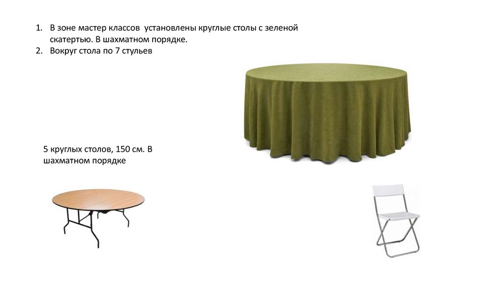 1. В зоне мастер классов установлены круглые столы с зеленойскатертью. В шахматном порядке.