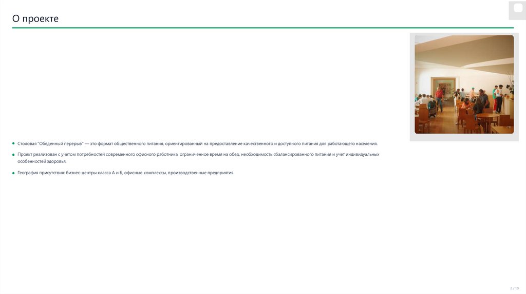 О проектеСтоловая "Обеденный перерыв" — это формат общественного питания, ориентированный на предоставление качественного и доступного питания для работающего населения.