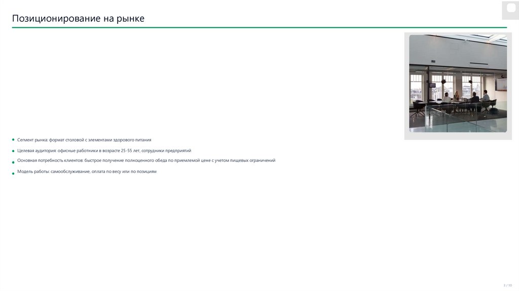 Позиционирование на рынкеСегмент рынка: формат столовой с элементами здорового питания