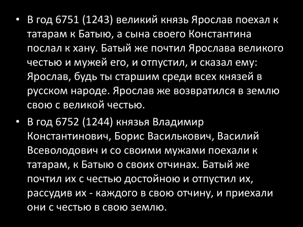• В год 6751 (1243) великий князь Ярослав поехал ктатарам к Батыю, а сына своего Константина