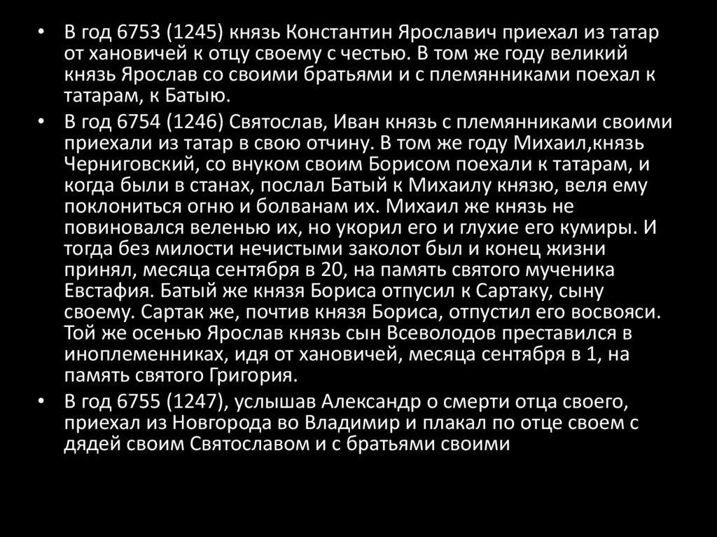 • В год 6753 (1245) князь Константин Ярославич приехал из татарот хановичей к отцу своему с честью. В том же году великий