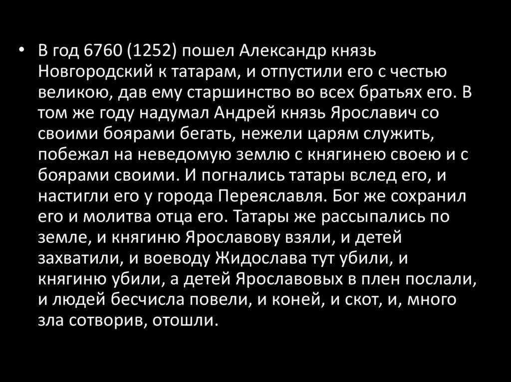 • В год 6760 (1252) пошел Александр князьНовгородский к татарам, и отпустили его с честью