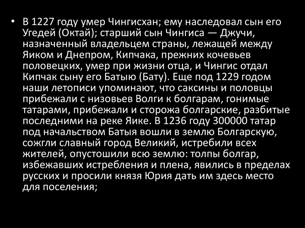 • В 1227 году умер Чингисхан; ему наследовал сын егоУгедей (Октай); старший сын Чингиса — Джучи,