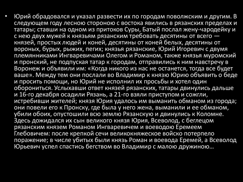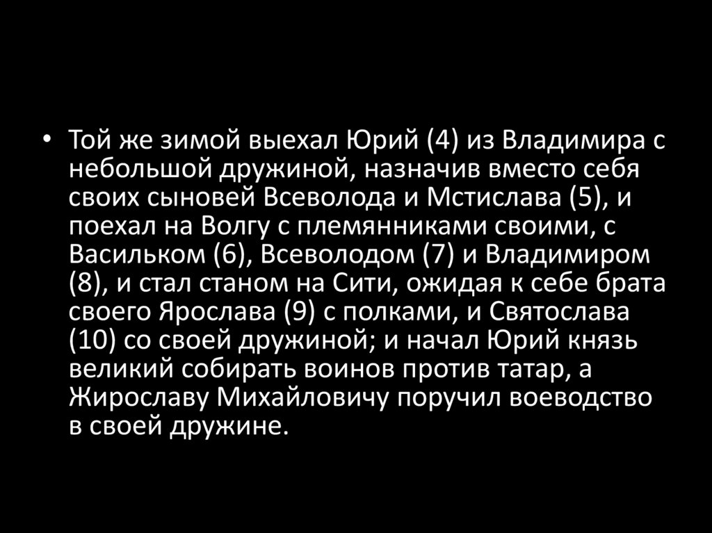 • Той же зимой выехал Юрий (4) из Владимира снебольшой дружиной, назначив вместо себя